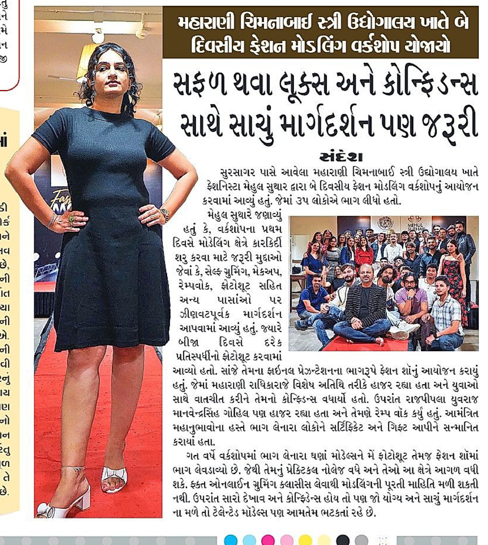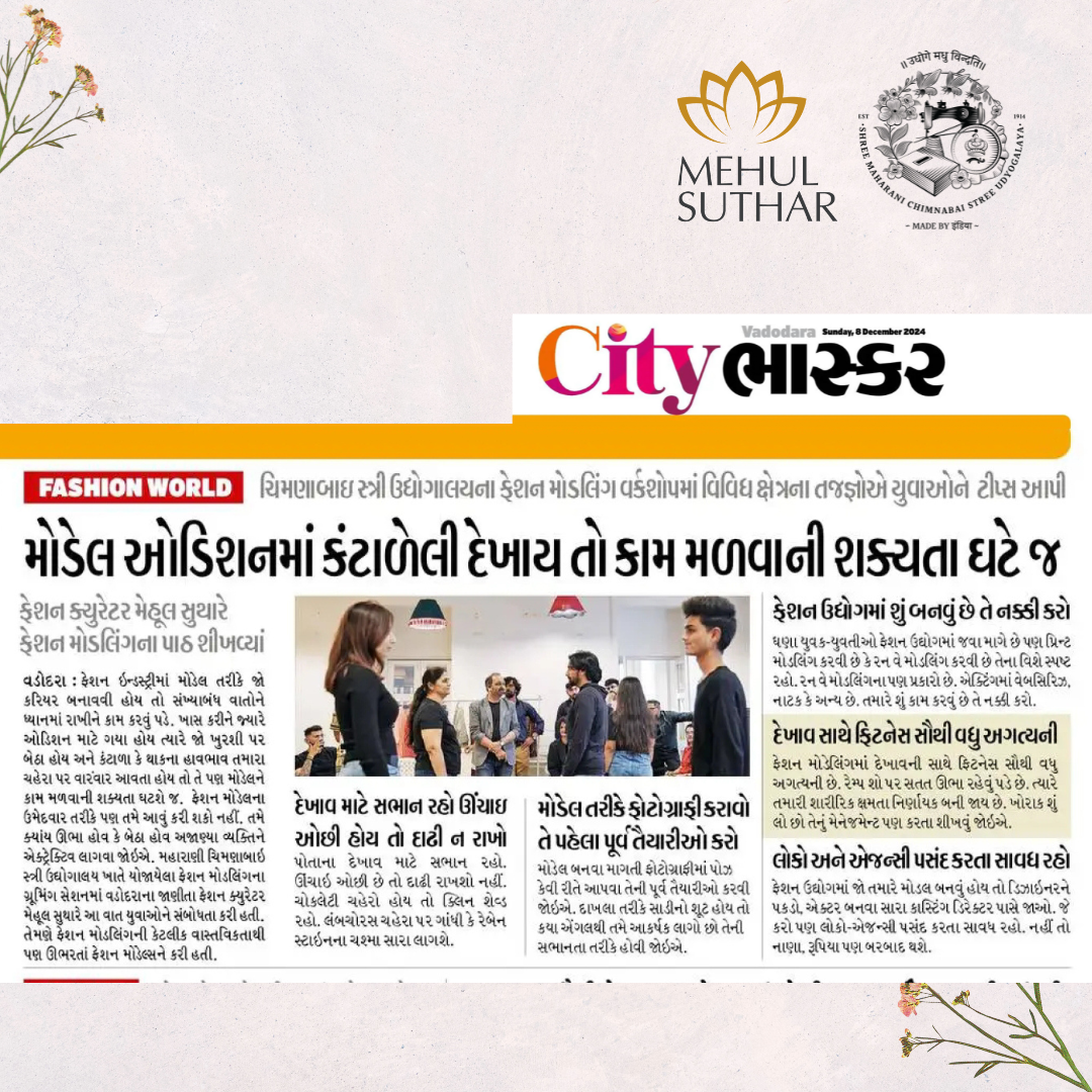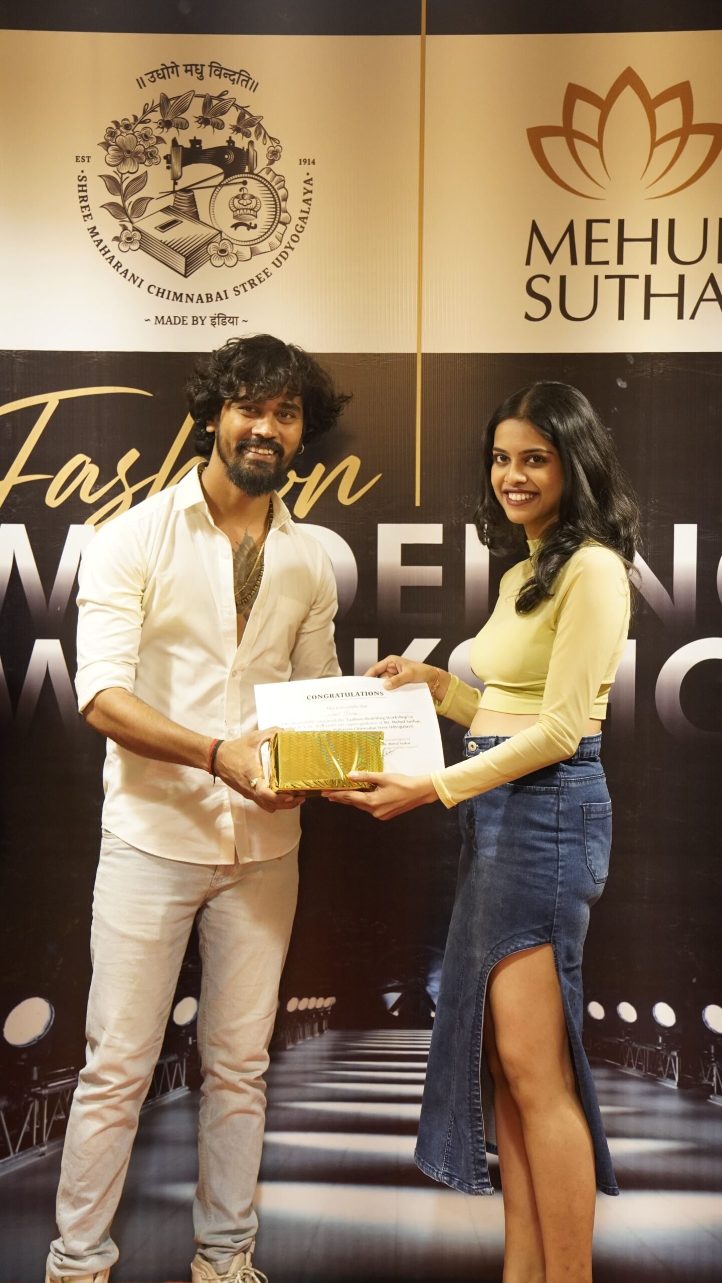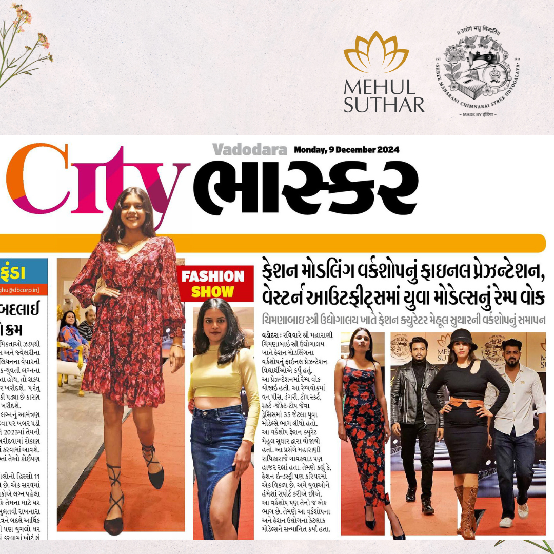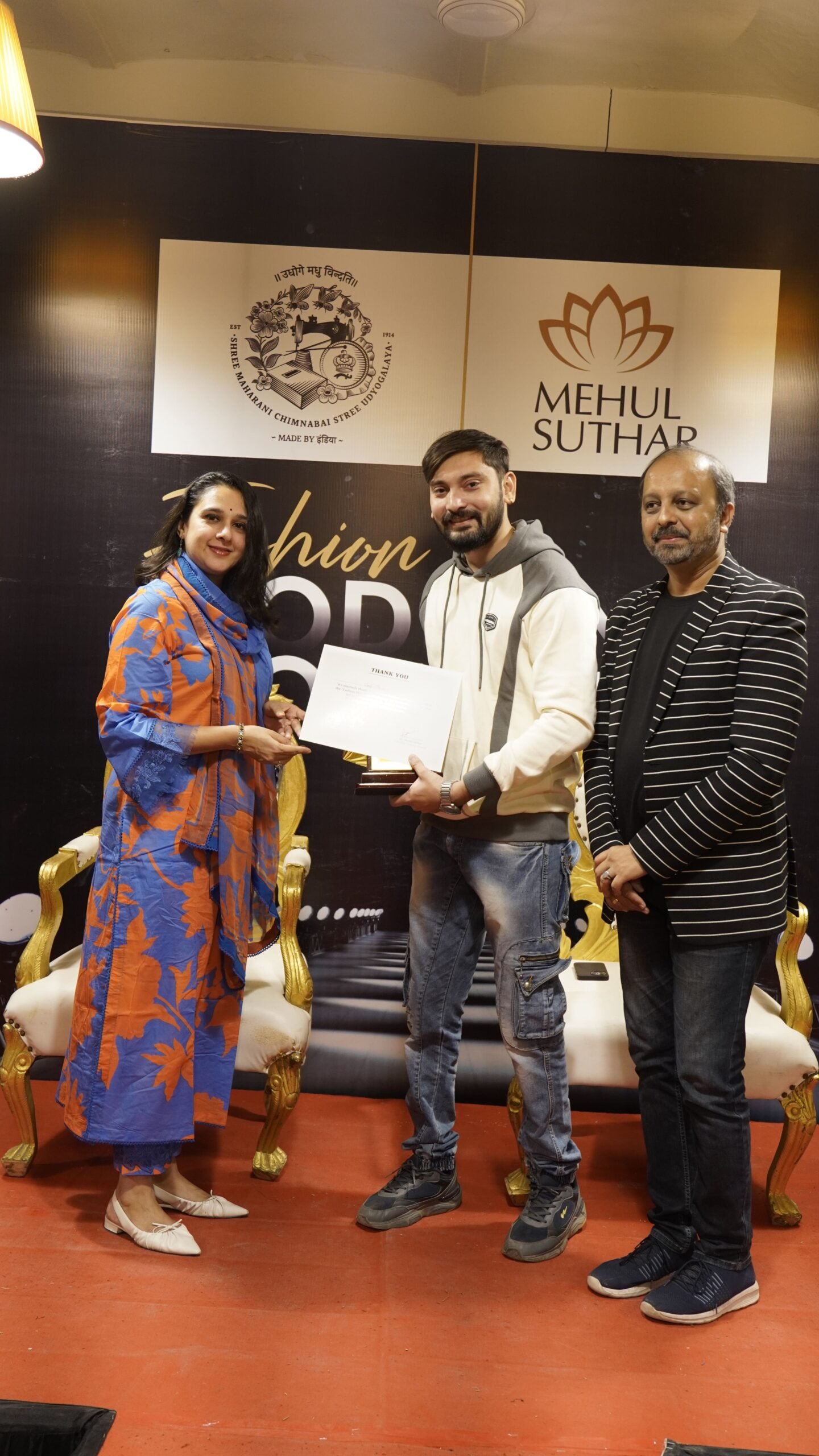 In 2024, renowned fashion expert and mentor Mehul Suthar successfully co-organized the Second Edition of the Fashion Modeling Workshop in collaboration with Shri Maharani Chimnabai Stree Udyogalaya, Vadodara.